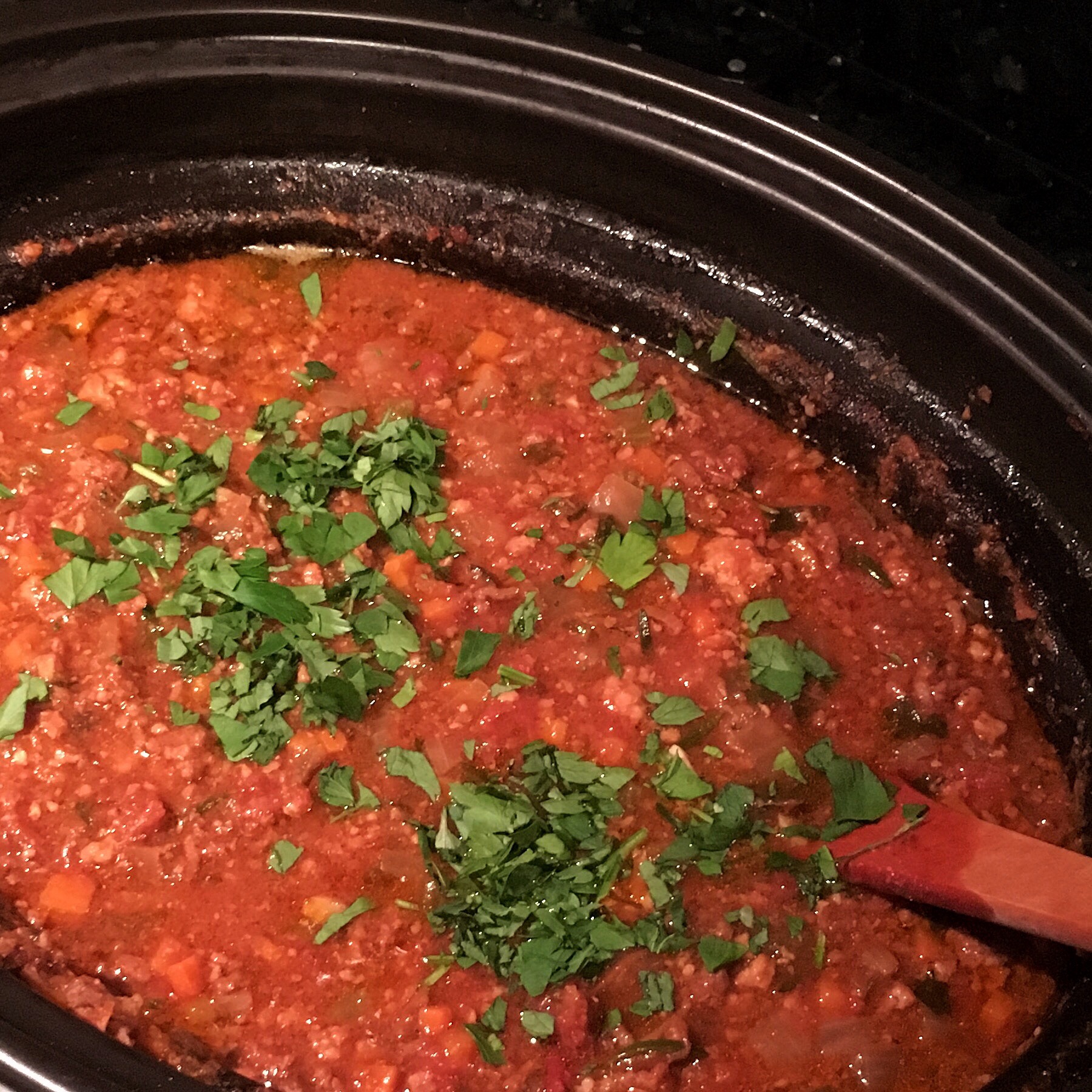 - About 30 minutes before serving, remove the cover and mix well, making sure to break up any clumps of meat that might exist. You want the meat to be finely crumbled at this point. Continue to cook on low, uncovered, for the final 30 minutes, stirring every 5-10 minutes. Just before combining with the pasta, stir in 3/4 cup of the remaining chopped parsley, saving the final 1/4 cup to garnish each serving.