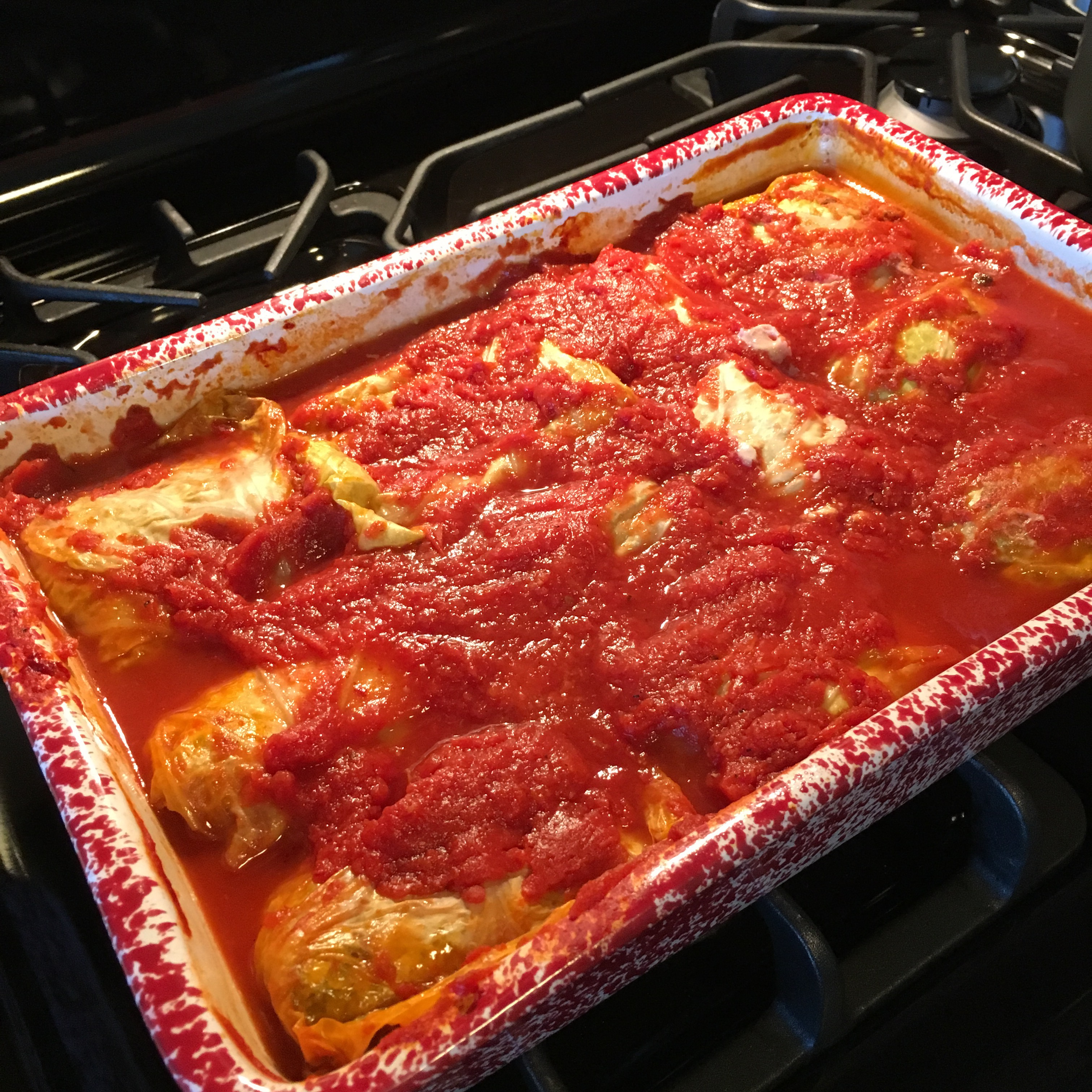 - Pour the remaining tomato sauce evenly over the cabbage rolls. Cover the rolls with a 13”x9” piece of parchment paper, then tightly cover the baking dish with aluminum foil.