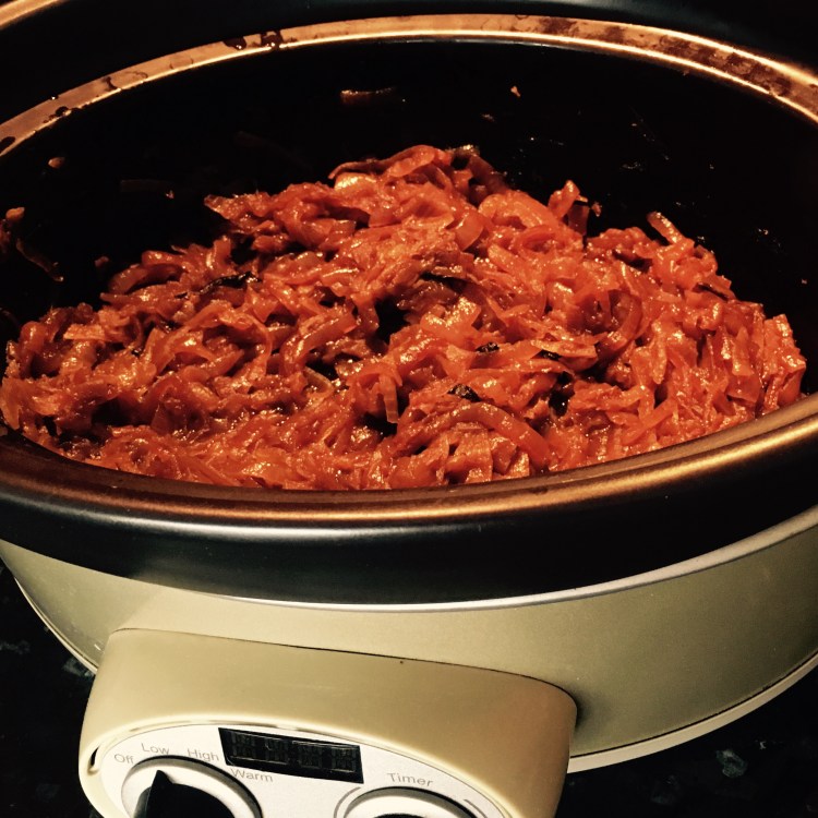 - Cover and cook on Low for 12 hours. If possible, give them a good stir after 10 hours, return the lid and continue cooking. You can also cook for the onions longer, this will give them a more jam-like consistency.